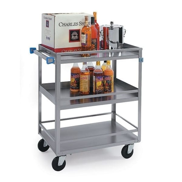 Utility Cart, Load Capacity 500 lb, Stainless Steel Material, 22 ga Gauge, Stainless Steel Finish, Overall Length 31 in, Overall Width 19 in, Number of Shelves 3, Distance Between Shelves 9 in, Shelf Length 27 in, Shelf Width 18 in, Includes (2) Bumpers on Front Legs, 4 in Swivel Casters, Front Rail on Each Shelf, Push Handle with Bumpers, Sound Deadened, Assembled/Unassembled Assembled