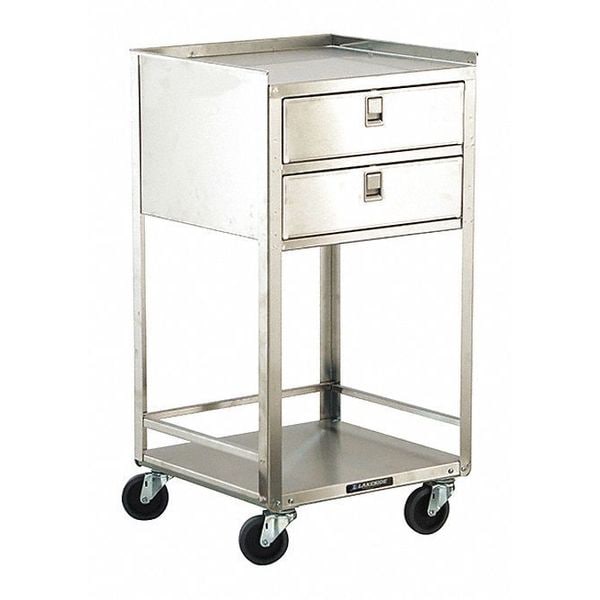 Corrosion-Resistant Mobile Medical Equipment Stand, Assembled/Unassembled Assembled, Material Stainless Steel, Load Capacity 300 lb, Caster Wheel Dia. 3-1/2 in, Caster Wheel/Tread Material Polyurethane, Caster/Wheel Configuration (4) Swivel, Caster Brake Type No Brake Included, Cabinet Color Silver, Drawer Color Silver, Number of Drawers 2, Number of Shelves 2, Shelf Length 18-3/4 in, Shelf Width 16-3/4 in
