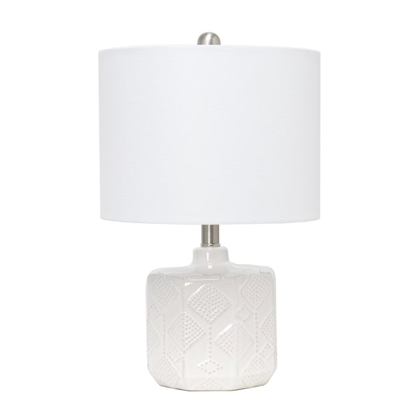 Adorn your space with this beautifully crafted ceramic table lamp. Aesthetically designed with an angular base and embellished with a floral studded texture adding elegance to your space. The white fabric drum shade accents the off-white finish for a clean, fresh look. Perfectly designed for your bedroom nightstand or home office or use as an accent piece in a common area such as your living room or foyer.