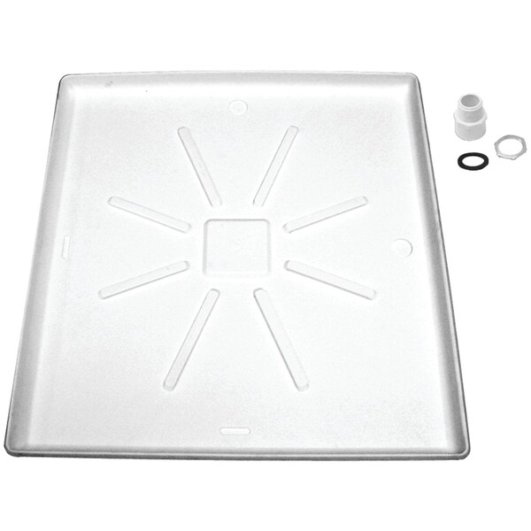 The Lambro Washing Machine Tray fits standard sized machines and is 29 in. x 31 in. Along with the tray comes a drain fitting. The instructions provide detailed descriptions for easy installation and usage.