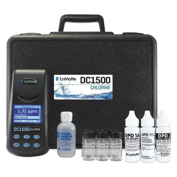 Colorimeter, Chlorine, 0 to 4.0 ppm Range, Accuracy +/-2 Percent Full Scale, Resolution 0.01 ppm, Free Chlorine 0 to 4.0 ppm, Total Chlorine 0 to 4 ppm, Chlorine Resolution 0.01 ppm, Chlorine Accuracy +/-2 Percent of Full Scale, Includes (6) Sample Vials, Carrying Case, DPD Liquid Reagents for 140 Tests