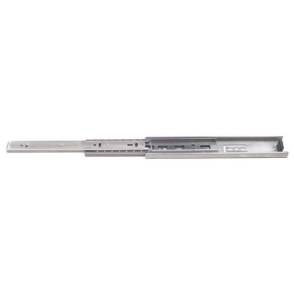 Drawer Slide, Closure Type Non-Self-Closing, Mounting Type Side, Glide Mechanism Ball Bearings, Finish Unfinished, Extension Type Full Extension, Disconnect Method Lever, Closed Length 17 23/32 in, Travel Length 17 23/32 in, Side Mount Load Cap. per Pair 100 lb, Load Capacity 100 lb, Extended Length 35 7/16 in, Detent Type Hold-In, Material Stainless Steel, Natural, 1 Pair