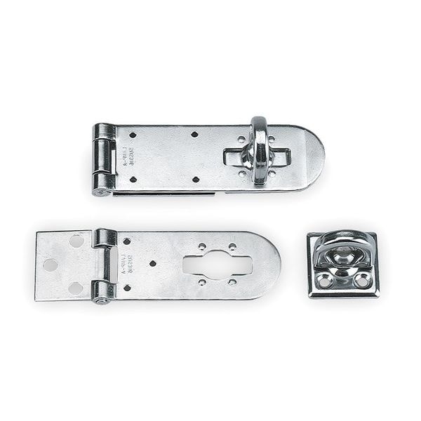 Hasp, Hasp Staple Type Rotating, Hasp Style Locking, Hasp Material Stainless Steel, Hasp Finish Bright Stainless Steel, Hasp Length 6 in, Hasp Width 2 in, Hasp Height 1 5/32 in, Max. Shackle Dia. 19/64 in, Includes Fasteners, Strike Plate