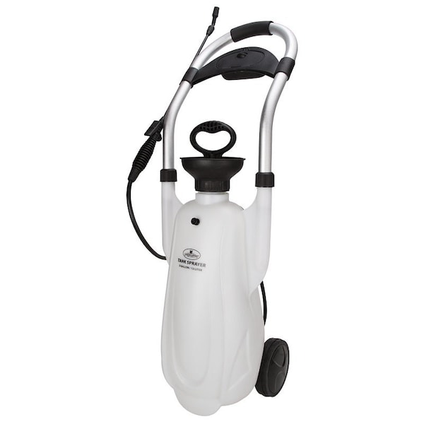 Rolling pressure sprayer with 2 wheels. General-purpose pressure sprayer ideal for spraying water, fertilizers, herbicides, pesticides and much more. Sprayer wand with adjustable sprayer nozzle and On/Off trigger lock. Pump and sprayer constructed of non-corrosive polyethylene, heavy-duty hose.