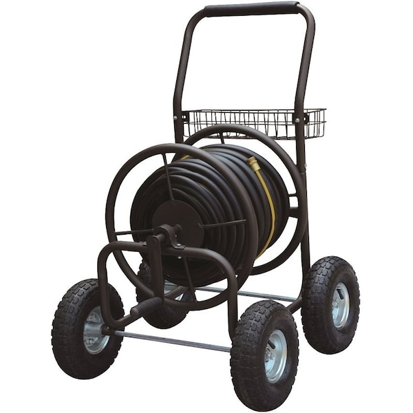 Holds up to 250 ft of 5/8 in Dia hose (not included). Convenient top storage basket. 10 in pneumatic wheels with steel rim. Durable powder-coated steel construction. Overall dimension of 30-1/4 x 24-1/4 x 36-1/4 in. 6 ft leader hose included.