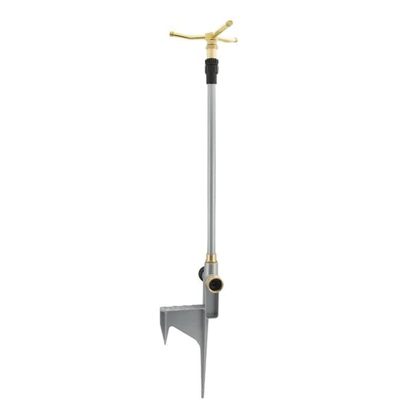 Three arm heavy-duty non-corrosive zinc and brass head for long-lasting use. Coverage of up to 50 ft Dia. Footstep spike for easy and stable installation. Telescoping height adjustment. Ideal for garden, shrubs and flowers. Adjusts from 20 to 33 in. Coverage is up to 50 ft Dia.