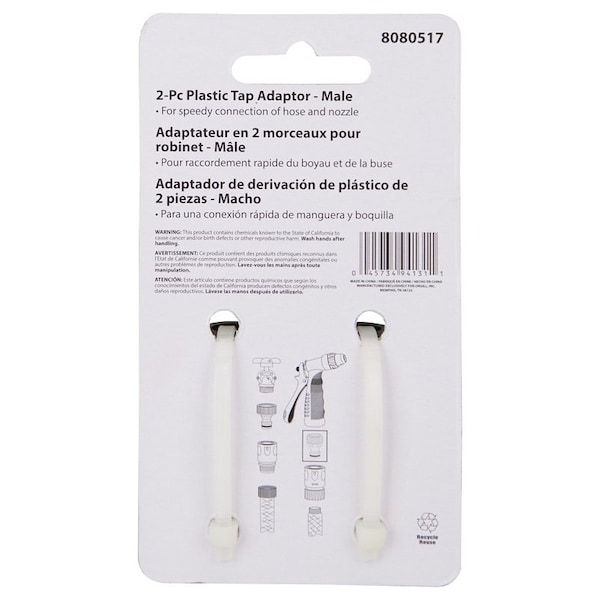 3/4 in plastic male thread tap adapter. In use with 3/4 in quick connector for speedy connection of hose and nozzle.