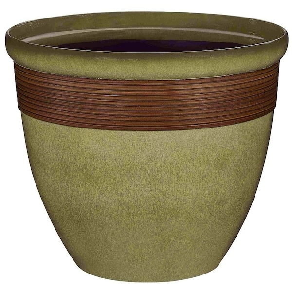 Landscapers Select Tall Wave Planter, Floor Standing, Round, 0.635 cu-ft, Olive Green/Wood, Olive Green with Wood Accent, Resin, Number of Tiers: 1, 15 in Dia, 12.5 H, Indoor/Outdoor: Indoor/Outdoor