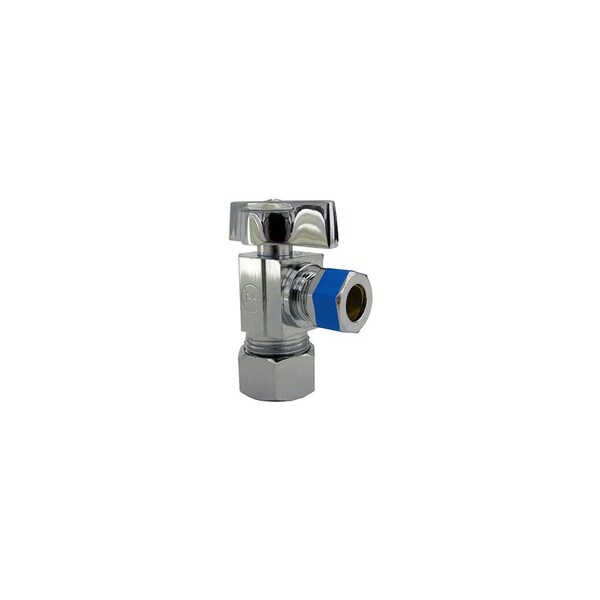 5/8in O.D. Compression Inlet x 3/8in Compression Outlet, Quarter Turn, Chrome, Angle Valve, California & Vermont Lead Free Compliant Product, Carded.