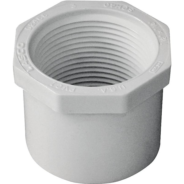 LASCO Reducing Bushing, Nominal Size 112 x 114 in, Spigot x FNPT Connection, Operating Temperature 140 deg F, Schedule Rating SCH 40, PVC, White