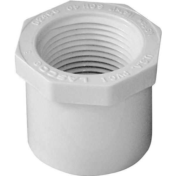 LASCO Reducing Bushing, Nominal Size 114 x 1 in, Spigot x FNPT Connection, Operating Temperature 140 deg F, Schedule Rating SCH 40, PVC, White