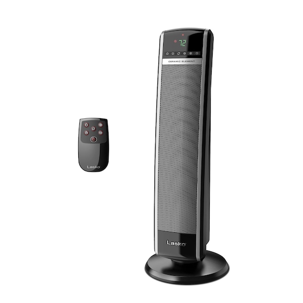 Stay warm and comfortable all season long with the Lasko Digital Ceramic Tower Heater with Remote Control. Designed with 1500 watts of powerful ceramic heat, this space heater is perfect for warming large spaces such as bedrooms, living rooms, or home offices. The easy-to-read digital display and programmable thermostat let you customize your comfort, while 2 quiet heat settings-High and Low-give you the flexibility to heat your room just the way you like it. For even coverage, widespread oscillation evenly distributes heat throughout the room, so no corner is left cold. With an 8-hour auto-off timer, you can set it and forget it, enjoying peace of mind whether you’re heading to bed or stepping out. The convenient multi-function remote control operates the heater from across the room and even stores neatly onboard.