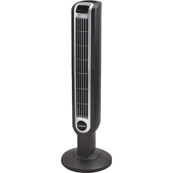 Easy-to-use electronic controls. 3 quiet speeds. 7-hour auto-off timer. Widespread oscillation for full room coverage. Multi-function remote control with on-board storage. Slim space-saving design is ideal for bedrooms home offices and more. High-reaching tower fan design for maximum air delivery. Features Laskos trusted safety fuse technology. Simple base assembly required.