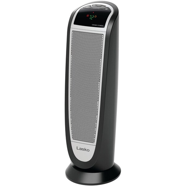 Quickly warm-up with a Lasko Digital Ceramic Tower Heater with Remote Control. This heater is designed with an elongated heating element to distribute 1500 watts of soothing warmth. Easy-to-operate digital controls run a programmable thermostat, 8 hour auto-off timer and 2 quiet heat settings. It's widespread oscillation evenly disperses heat throughout the room. The automatic overheat protection provides safety and peace of mind. Includes an easy-grip carry handle and a convenient onboard remote control storage area.