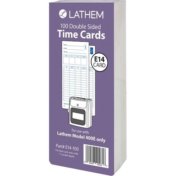 Double-sided time cards are designed especially for use with Lathem 400E Time Clock. One side works for daily clock ins while the other side is used for semi-monthly and monthly time periods only. Side 1 includes prompts for name, ID number, period description and signature as well as two in/out boxes for 15 rows and boxes for regular time total, overtime 1, overtime 2 and gross. Side 2 offers a 16 rows each with two in/out boxes and places for notes, name and ID number signature. Universal time card supports all pay periods. 7" height requires Lathem 25-7EX Time Card Rack (sold separately).