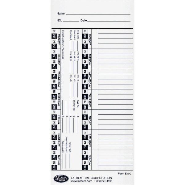 Universal time cards are designed for Lathem E-Series time recorders 900E, 1000E, 1500E, 2000 Series, 4000 Series, and 5000E. One-sided design features prompts for name and date and preprinted days from Monday through Sunday. Each day has two lines for "in" punches and two lines for "out" punches on the outside edge of easy print alignment. Each time card also includes a gross-to-net payroll deduction area and employee signature line. Time cards are made of high-quality, 150 lb. white tag stock.