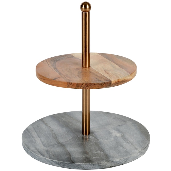 Serve your favorite apps in style with this marble and Acacia wood two tiered server by Laurie Gates! This gorgeous server is constructed with mixed materials that will bring a modern and stylish look to your home. Use this server as an every day staple piece, or take out for special occasions when guests come to visit. 2 tiers allows you to serve pastries, appetizers, finger foods, cheese and crackers, and more! Mix and match with other pieces from the collection to create gorgeously coordinated displays.