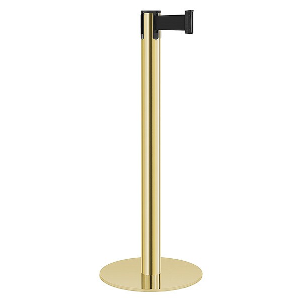 Barrier Post with Belt, Maximum Overall Height 40 in, Legend No Legend, Legend Color Not Applicable, Number of Belts 1, Belt Length 7 ft, Belt Width 2 in, Belt Color Black, Post Color Yellow, Product Type Stanchion, Includes Base, Single Retractable Belt, Minimum Overall Height Not Applicable, Post Diameter 2 3/4 in, Post Material Aluminum, Post Finish Polished Brass, Base Type Slim Profile, Base Diameter 14 1/2 in, Base Material Steel, Base Finish Polished Brass, ADA Compliance No