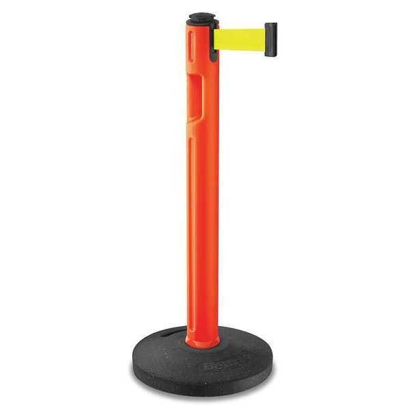 Barrier Post with Belt, Maximum Overall Height 38 1/4 in, Legend No Legend, Legend Color Not Applicable, Number of Belts 1, Belt Length 12 ft, Belt Width 2 in, Belt Color Fluorescent Yellow, Post Color Orange, Product Type Stanchion, Minimum Overall Height Not Applicable, Post Diameter 3 1/2 in, Post Material Plastic, Post Finish Textured, Base Type Basic, Base Configuration Detachable, Base Diameter 16 in, Base Material Rubber, Base Finish Unfinished, ADA Compliance No