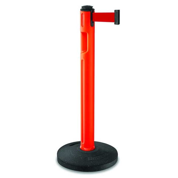 Barrier Post with Belt, Maximum Overall Height 38 1/4 in, Legend No Legend, Legend Color Not Applicable, Number of Belts 1, Belt Length 12 ft, Belt Width 2 in, Belt Color Red, Belt Pattern No Pattern, Post Color Orange, Product Type Stanchion, Minimum Overall Height Not Applicable, Post Diameter 3 1/2 in, Post Material Plastic, Post Finish Textured, Base Type Basic, Base Configuration Detachable, Base Diameter 16 in, Base Material Rubber, Base Finish Unfinished, ADA Compliance No