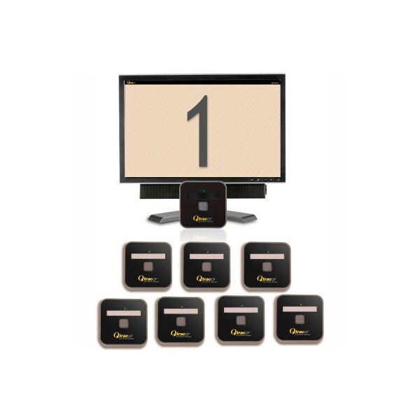 Qtrac plug and play with 32" lcd beige & gray display and 8 one button remotes the ultimate single-line electronic queuing solution. Qtraccfplug & play optimizes customer throughput and increases service efficiency by streamlining the way agents hail customers. With a simple button-push on qtrac's wireless remote, agents instantly alert the next waiting customer and effortlessly guide them to an open service position using both audio and visuals from the beige & gray 32" lcd display. this eight station system cones preconfigured and ready to operate out of the box.