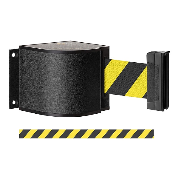 Retractable Belt Barrier, Mounting Style Wall, Belt Length 24 ft, Belt Color Black/Yellow, Belt Pattern Diagonal Stripe, Legend No Legend, Legend Color Not Applicable, Frame Color Black, Overall Height 3 3/8 in, Includes 3011 Wall Receptacle, Includes Mounting Hardware Included