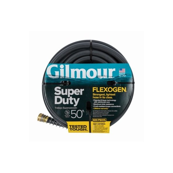 Gilmour 5/8 x 50 Super Duty Flexogen Hose Provides Superior Performance For Every Home & Garden Use Long Life & Durable 600 PSI Light Weight & Kink Resistant 8.1% Less Weight Patented 8 Layer Technology Flexible For Easy Handling Easy Grip Heavy Duty Brass Couplings Metal Strain Relief Lifetime Warranty.