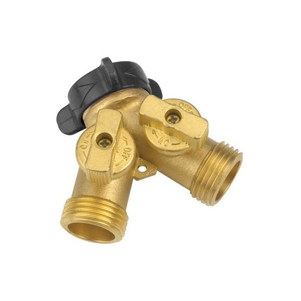 Dual Brass Hose Connector Dual Shut Off Valve Controls Water Flow For 2 Hoses Large Handles For Easy Grip & Turn Easy On Swivel Connector Assures Accurate Connection To Faucet Withstands Hot Water Temperatures.