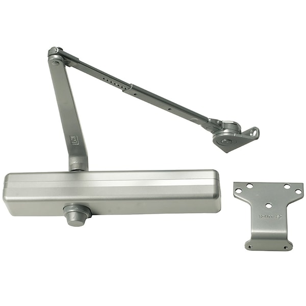 Grade 1 Tri Mount Surface Closer, Push or Pull Side, Double Lever Arm Friction Hold Open, Hold Open, Slim Plastic Cover, 180 Deg. Swing, With Parallel Arm Bracket, Delayed Action, Aluminum Painted Finish, Non-Handed