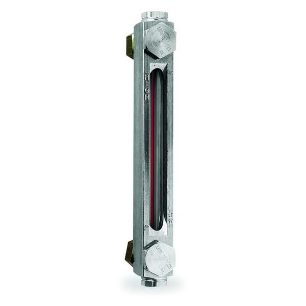 Closed Circuit Liquid Level Gauge, Pipe Adapter, Mounting Centers (In.) 5 in, 1/4 NPTF Brass Mounting Thread, Front Mounting, Max. Operating PSI 290 psi, Max. Operating Temp. (F) 250 Degrees F, Borosilicate Sight Glass, Aluminum, Used for Mounting in Heavy Wall Tank or Weld Spuds on Reservoir Walls