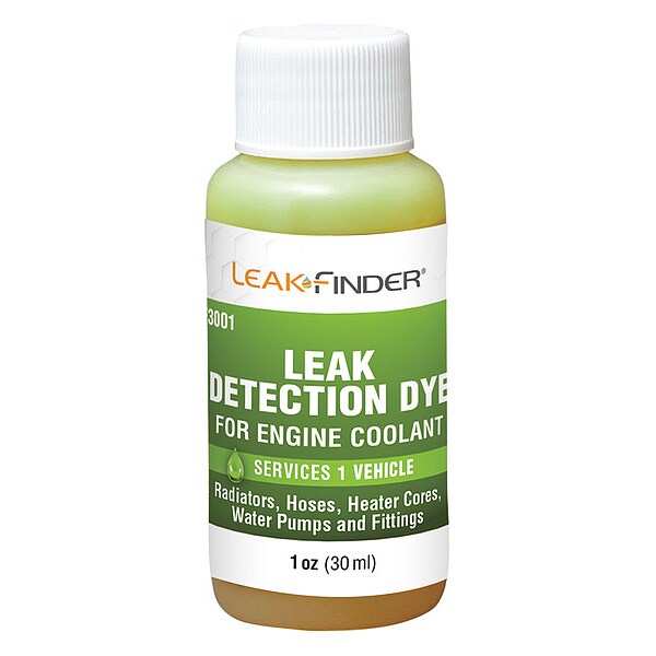 Leak Detection Dye, Compatible Fluid Type Coolant, Series Coolant Dye, Container Type Bottle, Container Size 1 oz, Color Green, Standards Not Applicable, Product Type Leak Detection Dye, Boiling Point 212 Degrees F, Features Finds Leaks in Radiators, Hoses, Heater Cores, Water Pumps and Fittings, Flash Point 212 Degrees F, Fluorescent Fluorescent, Maximum pH Level 9, Product Form Liquid, Specific Gravity 1.00, Package Quantity 6