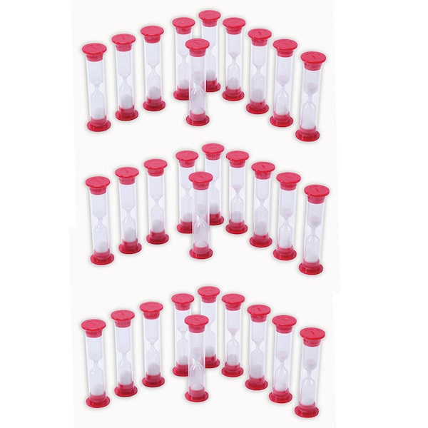 Sand timers are great for games, times tests and other classroom time managements. Each pack includes 10 plastic, safe, one minute timers. Sold as 3 packs for a total of 30 timers.