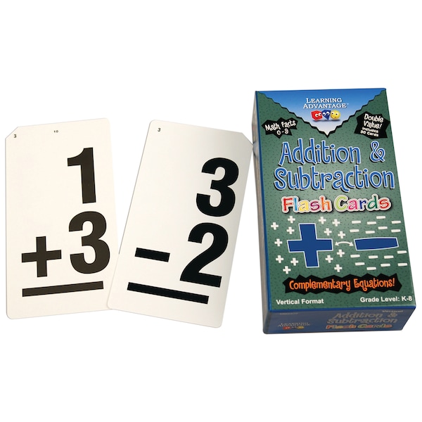 Notched corners for quick organization. Large, easy to handle 6-1/4" x 3-1/4" cards. Bold, heavy type to use with large groups. Durable, thick card stock (14 pt.). Self-checking. Great for small groups, pairs, and whole class participation. Great for teaching the relationship between +/-, (e.g.: 3+1=4 on one side, 4-1=3 on the reverse).