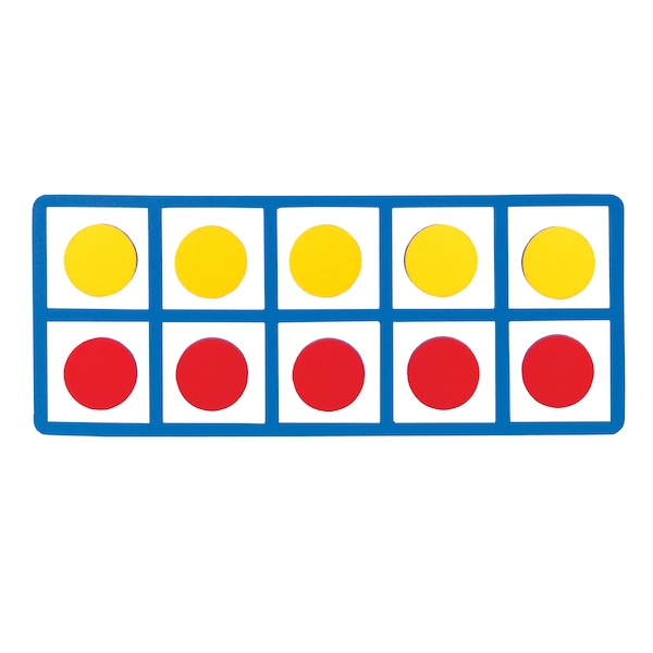 A great visual aid for the demonstration number concepts on the whiteboard! Promotes composing and decomposing numbers, develops numbers sense and base-ten concepts, and operations skills (addition and subtraction). Ten frames can be used to develop students' subitizing skills, the ability to "instantly see how many". This skill plays a fundamental role in the development of students' understanding of numbers. Teachers and students will engage in base ten, operation skills and other number skills as a group or center activity. Set includes 2 magnetic foam Ten-Frames and 20 disks (10 red and 10 yellow disks). Foam makes it easy to remove pieces from white board. Each Ten-Frame measures 5" x 12-1/4".
