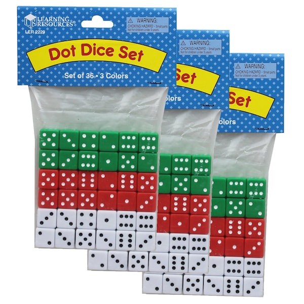 Dot Dice, Red, Green + White, 36 Pieces, PK3