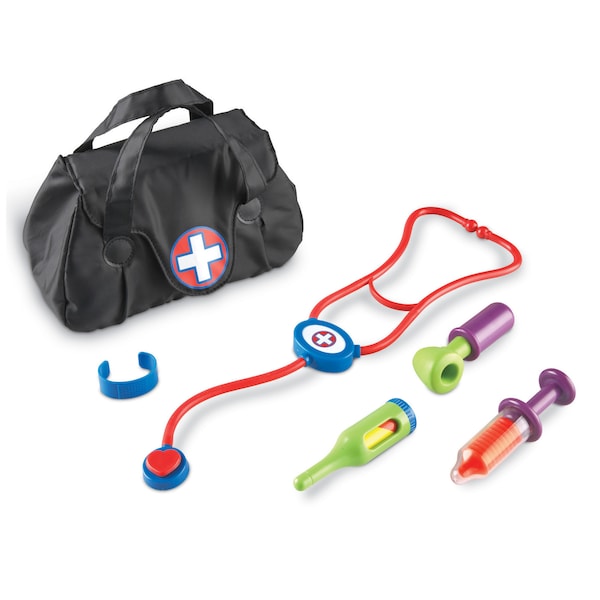 Safe practice for the youngest wanna-be docs! Chunky tools made from durable, soft plastic are perfect for encouraging early imaginative play. Students can work through anxieties and apprehensions for upcoming doctors' visits by acting out what happens during the appointment. Refines fine motor skills needed for everyday living without even realizing they are developing muscles and movement. As students treat their patients, they are getting a lesson in receptive and expressive language. Listen to what hurts, form and ask questions to pull more information out of your patients so you can give them the care they need. Includes stethoscope, syringe, bandage, ear scope, thermometer, and vinyl bag measuring 6.75"W x 5"H.