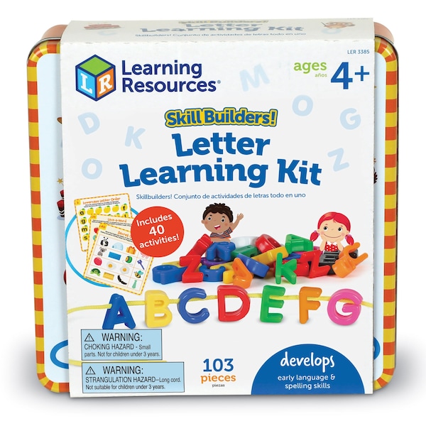 Looking for an easy way to help kids learn language skills? Introduce them to hands-on ABC learning toys and school-ready learning activities in one compact package! With 72 lacing letters and 40 workbook-style activities, this set helps kids learn phonics, spelling, sight words, and more! Best of all, the hands-on lacing letters also strengthen fine motor skills. How does this spelling toy help kids learn? Use the letters to make your own reading games, phonics games, and more! Made from durable plastic, the Skill Builders! Letter Learning Kit set comes with a carrying case for easy cleanup or on-the-go play, and makes an easy addition to homeschool supplies and speech therapy toys for toddlers. Age 4+, Grade PreK+