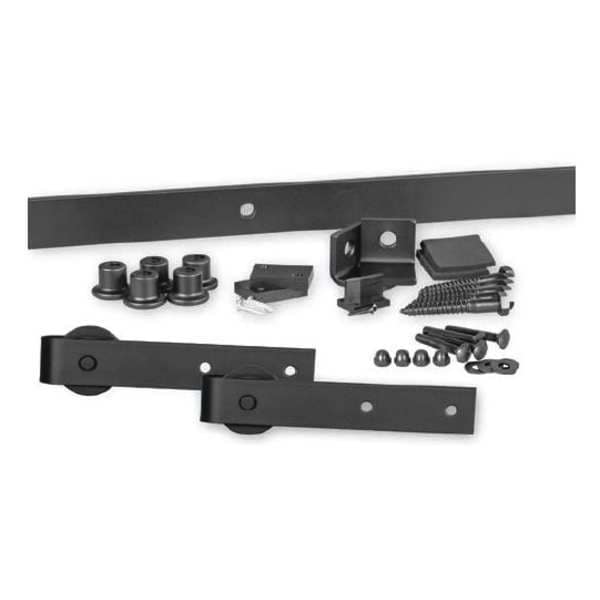 Track Kit, Barn Door, Max. Weight (Lb.) 400 lb, Steel, Black, Powder Coated Finish, Length (In.) 60 in, Height (In.) 5 in, Width (In.) 3 in, Outside Dia. 3 in, Wheel Diameter 3 in, Max. Wheel Dia. (In.) 3 in, Roller Width/Dia. (In.) 3, Surface Mounting, Steel Bearings, Number of Wheels 2, Steel, Hardware Included, Requires Door, For Use With Barn Door Hardware
