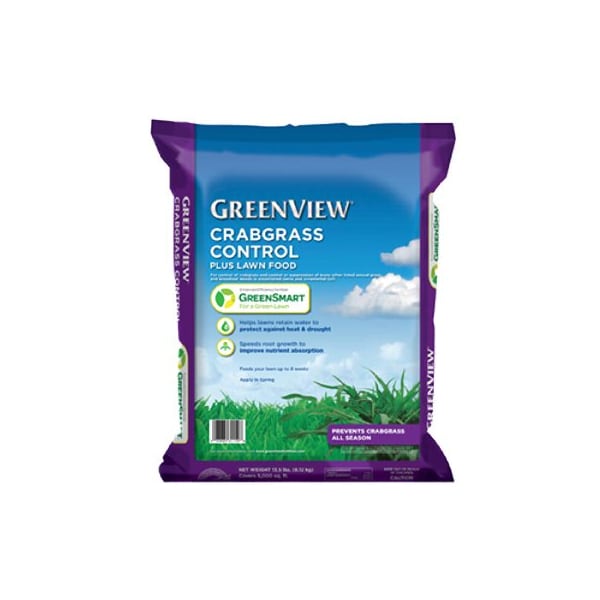 Greenview, 135 lb, Crabgrass Control and Lawn Food Bag Covers 5,000 sq ft Prevents crabgrass all season Restores nutrients to the soil Apply in spring, features both immediate release and time released nitrogen providing continuous feeding for up to 8 weeks