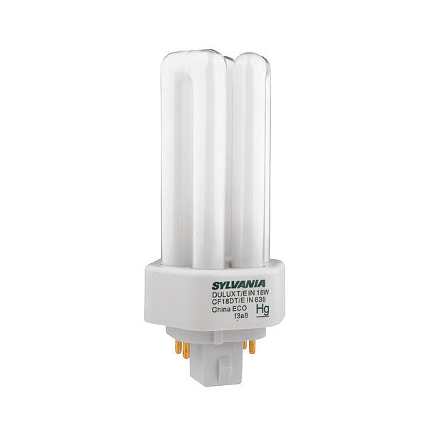Compact Fluorescent Bulb, Bulb Base Type 4-Pin (GX24q-2), Bulb Finish Frosted, Trade Number CF18DT/E/IN/827/ECO, Bulb Shape T4, Color Rendering Index 82, Color Temperature 2700K, Incandescent Wattage Equivalency 75 W, Lumens 1,165 lm, Bulb Housing Glass, Light Technology Fluorescent, Shatter-Resistant No, Voltage 80V AC, Watts 18 W, Bulb Beam Angle 360 Degrees , Three-Way No, Rough Service No, Dimmable Yes, Bulb Power Source Requires Separate Ballast, Light Color White