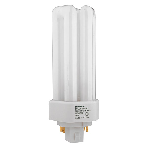 Compact Fluorescent Bulb, Bulb Base Type 4-Pin (GX24q-3), Bulb Finish Frosted, Trade Number CF26DT/E/IN/830/ECO, Bulb Shape T4, Color Rendering Index 82, Color Temperature 3000K, Incandescent Wattage Equivalency 100 W, Lumens 3,200 lm, Bulb Housing Glass, Light Technology Fluorescent, Shatter-Resistant No, Voltage 80V AC, Watts 26 W, Bulb Beam Angle 360 Degrees , Three-Way No, Rough Service No, Dimmable Yes, Bulb Power Source Requires Separate Ballast, Light Color White