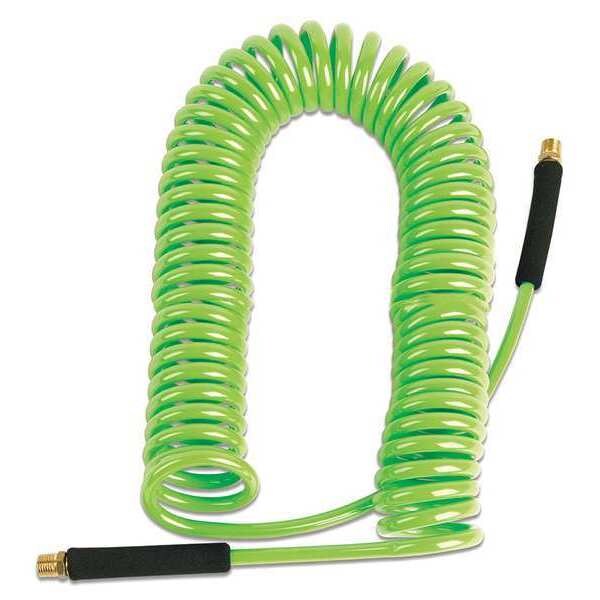 Coiled Air Hose, Hose Inside Dia. 3/8 in, Hose Outside Dia. 3/8 in, Hose Length 50 ft, Hose Color Green, Hose Tube Material Polyurethane, Hose Cover Material Polyurethane, Max. Working Pressure @ 70 F 125 psi, Temp. Range -45 Degrees to 150 Degrees F, Hose Fitting A Material Brass, Hose Fitting B Material Brass, Hose Fitting A Type MNPT, Hose Fitting B Type MNPT, Hose Fitting A Size 1/4 in, Hose Fitting B Size 1/4 in, Hose Configuration Coupled Assembly