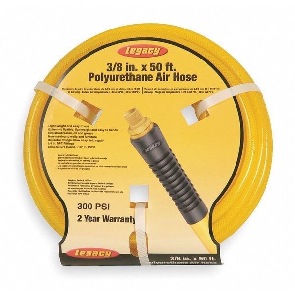 Multipurpose Air Hose, Hose Inside Dia. 1/4 in, Hose Length 50 ft, Hose Cover Material Polyurethane, Temp. Range -10 to 150 Degrees F, Safety Factor 3:1, Hose Fitting A Material Brass, Hose Fitting B Material Brass, Hose Configuration Coupled Assembly