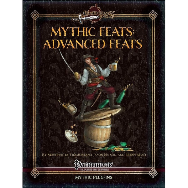 Advance Your Game - Mythic Feats: Advanced Feats is your encyclopedia for advanced character design with over 130 all-new mythic feats enhancing the options in the Pathfinder Roleplaying Game Advanced Class Guide from Aberrant Tumor to Wounded Paw Gambit and all feats in between. Whether your character is martial or magical a wide-ranging dilettante or a single-focus fanatic Mythic Feats: Advanced Feats contains mythic feats of every kind from entry-level basics to high-level specializations. You will find combat feats like Canny Tumble Pummeling Charge and Merciless Butchery alongside magical aids like Talented Magician Channeled Blessing and Flexible Wizardry. Of course there is a wide range of feats designed to enhance your class features from Raging Blood and Slayer's Feint to Battle Cry and Dueling Cape Deed alongside feats like Bookish Rogue Amateur Investigator and Seething Hatred that help you branch out into the tricks and talents of classes other than your own. They are all here every one developed with flair and function in mind as only Legendary Games can bring it by the same designers that wrote most of the mythic feats in Pathfinder Roleplaying Game Mythic Adventures in the first place. Grab this killer 30-page collection of advanced feats by today and Make Your Game Legendary! Features -Mythic Feats - Advanced Feats Game -Easy to Use