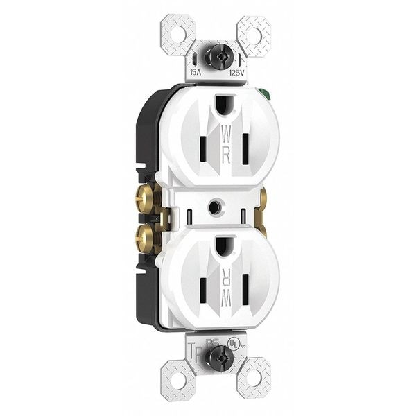 Receptacle, Connection Orientation Straight, Current Rating 15 A, Grounding Grounded, Housing Color White, Housing Material Thermoplastic Polyester, Mount Type Flush, NEMA Receptacle Configuration 5-15R, Number of Gangs 1, Number of Poles 2, Number of Wires 3, Phase Single, Receptacle Type Duplex, Resistance Properties Tamper Resistant, Weather Resistant, Standards cULus Listed, UL 498, Voltage Rating 125V AC, Wiring Method Back, Side, Horsepower Rating 1/2 hp, Surge Protection No