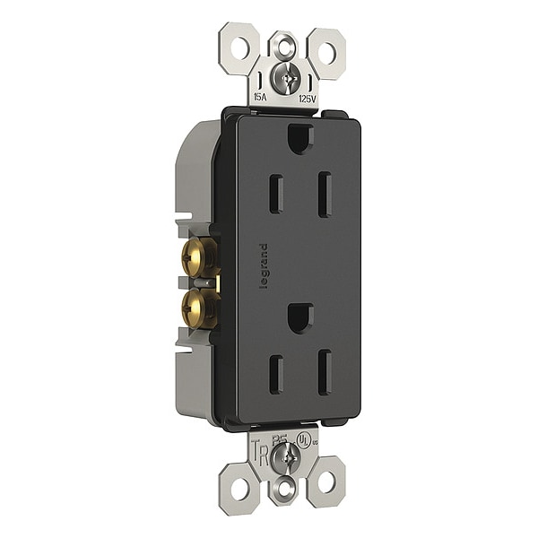 Receptacle, Connection Orientation Straight, Cover Type No Cover, Current Rating 15 A, GFCI No, Grounding Grounded, Hazardous Location Specification Not Applicable, Housing Color Graphite, Housing Material Plastic, Mount Type Recessed, NEMA Enclosure Rating 5, NEMA Receptacle Configuration 5-15R, Number of Gangs 1, Number of Poles 2, Number of Wires 3, Phase Single, Polarized No, Receptacle Type Duplex, Resistance Properties Tamper Resistant, Standards cULus Listed, Voltage Rating 125V AC