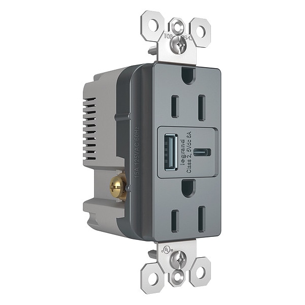USB Charger Receptacle, Current Rating 15 A, Housing Color Gray, Number of USB Ports 2, Number of Wires 3, Power Indicating Light No, Receptacle Type Duplex, Resistance Properties Tamper Resistant, USB Connection Type A, C, Voltage Rating 125V AC, Wiring Method Back, Side, Grade General Use, Housing Material Nylon, Mount Type Flush, NEMA Receptacle Configuration 5-15R, Number of Poles 2, Standards cULus