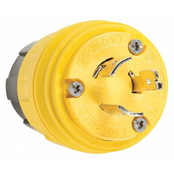 Watertight Locking Plug, Current Rating 20 A, Housing Color Yellow, Housing Material Nylon, NEMA Plug Configuration Non-NEMA, Number of Blades 4, Number of Poles 3, Phase Single, Resistance Properties Corrosion Resistant, Voltage Rating 125V AC, Wiring Style Standard, Face Diameter 1.85 in, IP Rating IP67, Market Industrial, Shrouded No, Standards CSA Certified, UL Listed, UL 94 Flammability Rating V-0