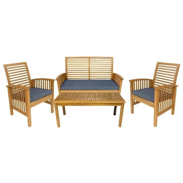 Modern, elegant and made with natural hardwood acacia, this Sequoia collection four-piece patio set's wide seating and ergonomic back is designed for maximum comfort. The chairs and loveseat come with polyester woven cushions for soft supportive seating and the wood is sanded and stained for a smooth finish. The sleek coffee table provides ample space for group refreshments. This set is the ideal conversation piece for the poolside, porch, patio or indoor and outdoor living space.