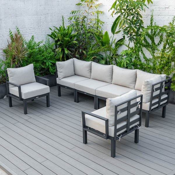 Unveil the epitome of outdoor luxury with the Chelsea Mid-Century Modern 6-Piece Sectional Set, meticulously crafted to combine innovative design, resilience, and unparalleled comfort. This comprehensive ensemble redefines the concept of outdoor living, turning your patio or backyard into a space that seamlessly merges style and relaxation. The patio set comprises 2 corner chairs and 2 armless chairs and 2 armchairs, forming a versatile and spacious seating arrangement. The structural backbone of the Chelsea set is crafted from premium aluminum and adorned with a sophisticated powder-coated finish in classic black, imparting an understated elegance that seamlessly blends with any outdoor aesthetic. Designed to withstand the rigors of changing weather, the Chelsea set is not only weather-resistant but also rust-resistant. Experience a new dimension of comfort with the plush, removable cushions that grace the patio set. Crafted for indulgence, these cushions offer a luxurious seating experience. The attention to detail extends to the cushion design, featuring ties that elegantly secure them to the chairs preventing the cushions from shifting. Preserving the integrity of your outdoor flooring, each chair in the Chelsea set is equipped with plastic cap floor protectors that shield your patio or deck from scratches and scuffs. Its assembly process is designed with your convenience in mind. Clear and concise instructions, along with all the necessary hardware, make the assembly a manageable task.